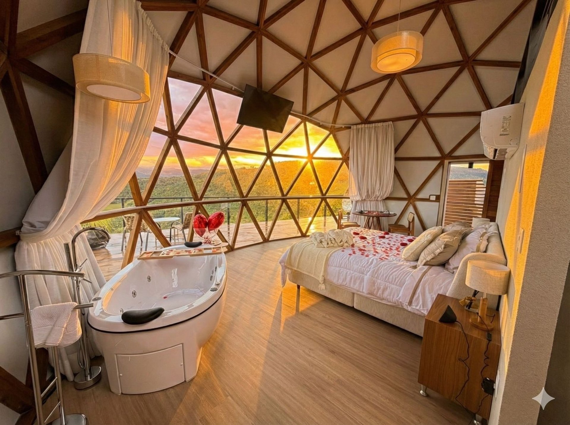 Com design vanguardista, nossos domos geodésicos são refúgios exclusivos projetados para casais que buscam conexão com a natureza sem abrir mão do luxo contemporâneo. Localizados a 1.600 metros de altitude, cada unidade foi estrategicamente posicionada para oferecer vistas privilegiadas das montanhas, garantindo privacidade absoluta e um ambiente climatizado para o seu total conforto. Uma experiência inesquecível onde o horizonte é o seu teto.